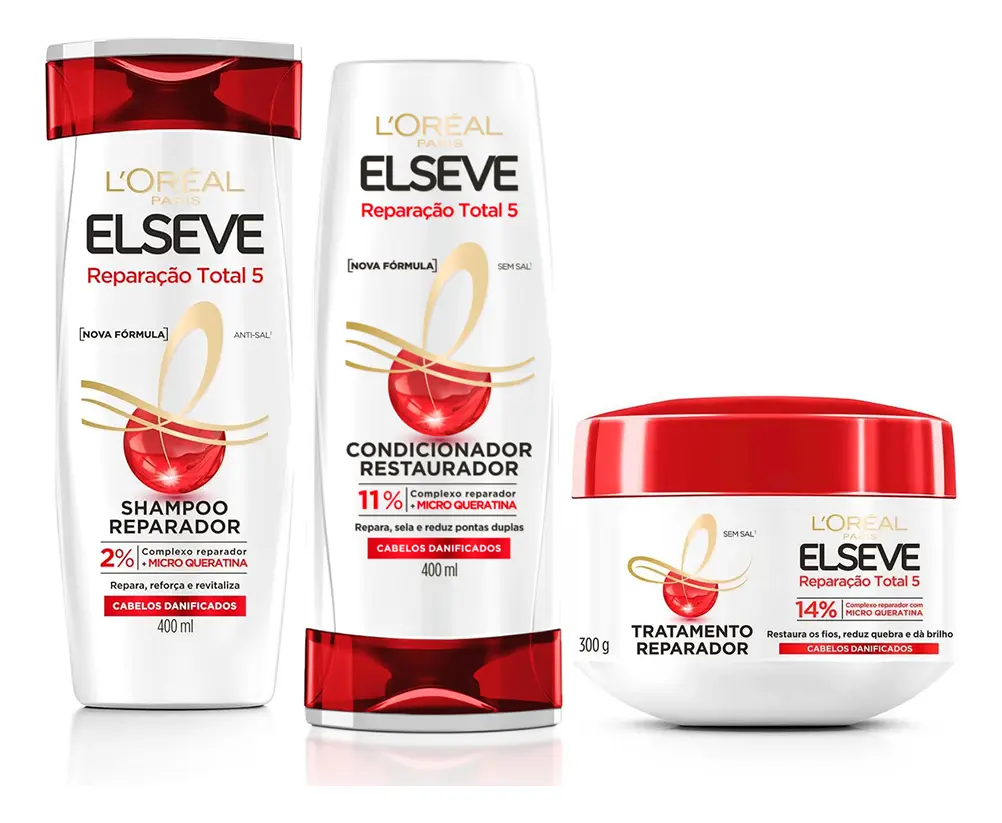 A Linha Elseve Reparação Total 5, totalmente reformulada, enriquecidA com Cicatri-Ceramida identifica e cicatriza os 5 principais danos causados no dia a dia: Quebra, rigidez, opacidade, ressecamento e ponta dupla. O cabelo fica reconstruído, transformado, reparado, macio e brilhante.